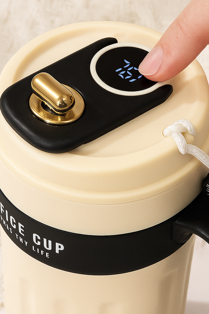Tryck lätt på locket och se exakt hur varm drycken är.